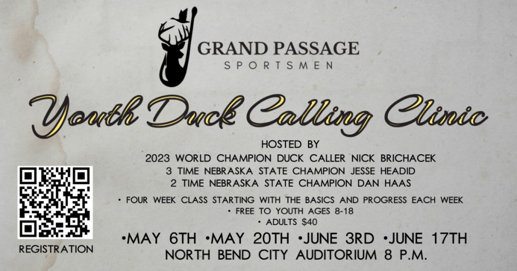 The Grand Passage Sportsmen will again be hosting a series of youth duck calling classes leading up to the Nebraska State Calling Contest. The classes are open to everyone, and participation in the state contest is not required. If you simply want to learn how to call, or improve on your calling, this will be a great opportunity. The classes will start with the basics and progress each week, with the last week focused on contest calling. Instructed by the current World Champion Duck Caller and past NE State Champions plus other expert duck callers. Must be at least 8 years old to participate.